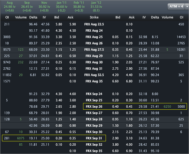 The company has traded over 40,000 options on total daily average option volume of just 8,680. 30,000 contracts traded in one trade; a Sep 9/10 risk reversal (sell puts/buy calls) on a 67 delta against $9.65 stock. The Stats Tab and Day's biggest trades snapshots are included (click either image to enlarge).