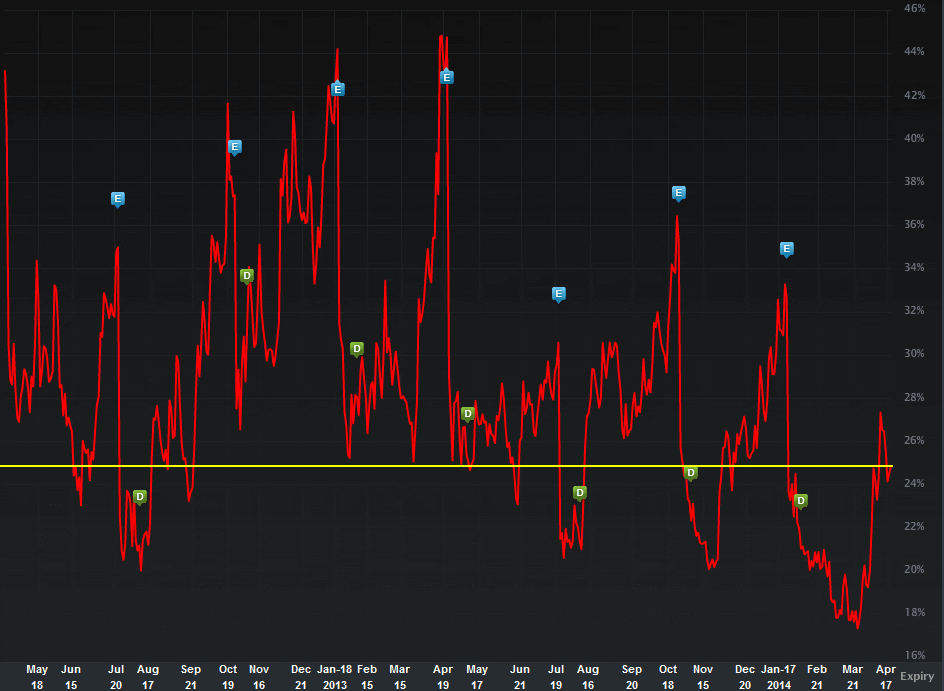 The blue "E" icons represent past earnings dates and I have drawn that yellow horizontal line to show where the current implied volatility lies relative to the history. In fact, let's just look at a cleaner chart below, which only includes the earnings dates.